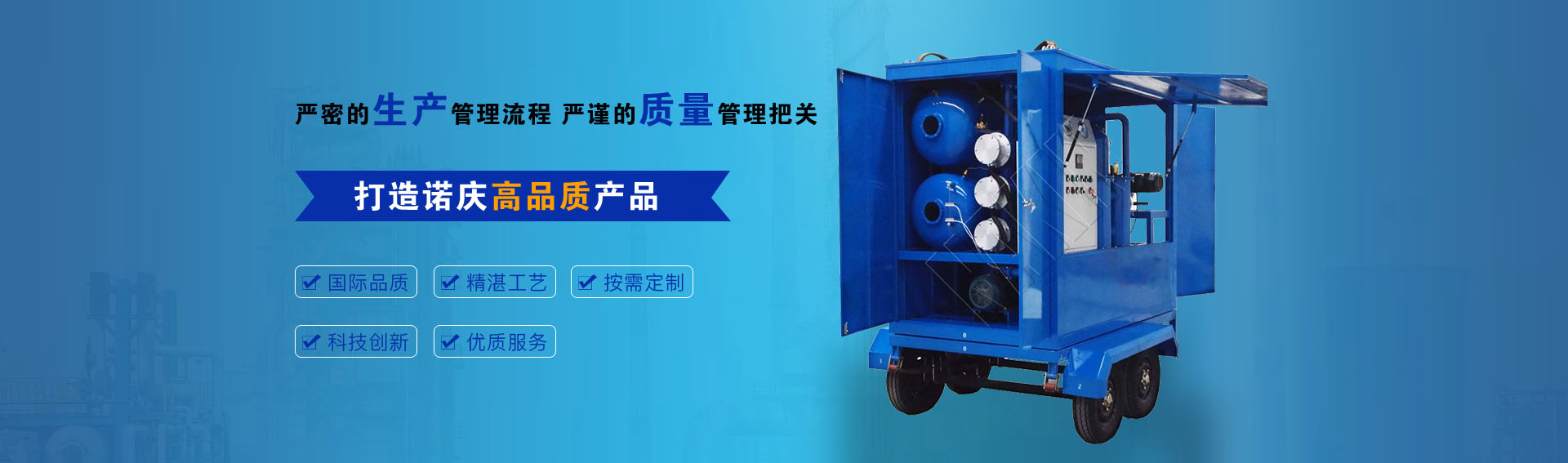 公司通過ISO9001-2015質(zhì)量管理體系認(rèn)證,CE歐盟認(rèn)證,諾慶公司所有濾油機配套產(chǎn)品均采用國內(nèi)外知名品牌,經(jīng)過多年的使用,具有質(zhì)量可靠,性能優(yōu)良。公司擁有完備的檢測儀器和檢測設(shè)備,所有產(chǎn)品出廠前經(jīng)過嚴(yán)格測試,保證每一臺產(chǎn)品合格出廠。